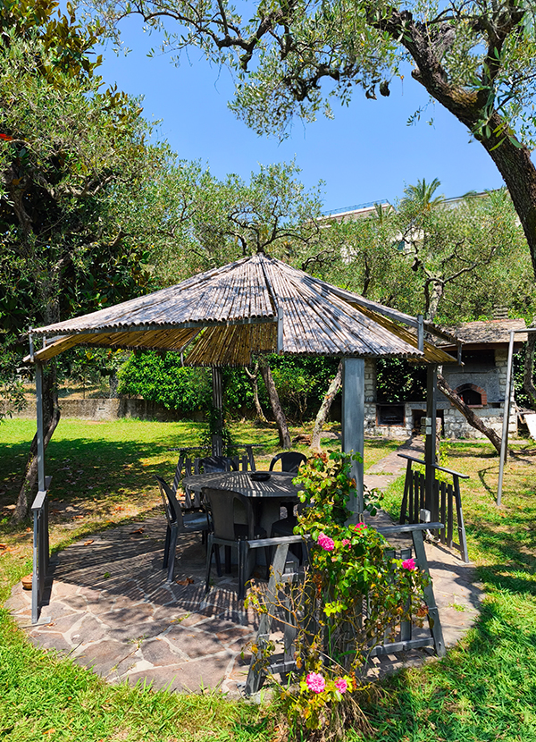 Il giardino di 1.500 mq di Villa Angelica è un vero paradiso, con piante, fiori, un gazebo per rilassarsi, , per i più sportivi, un tavolo da ping-pong e un canestro.