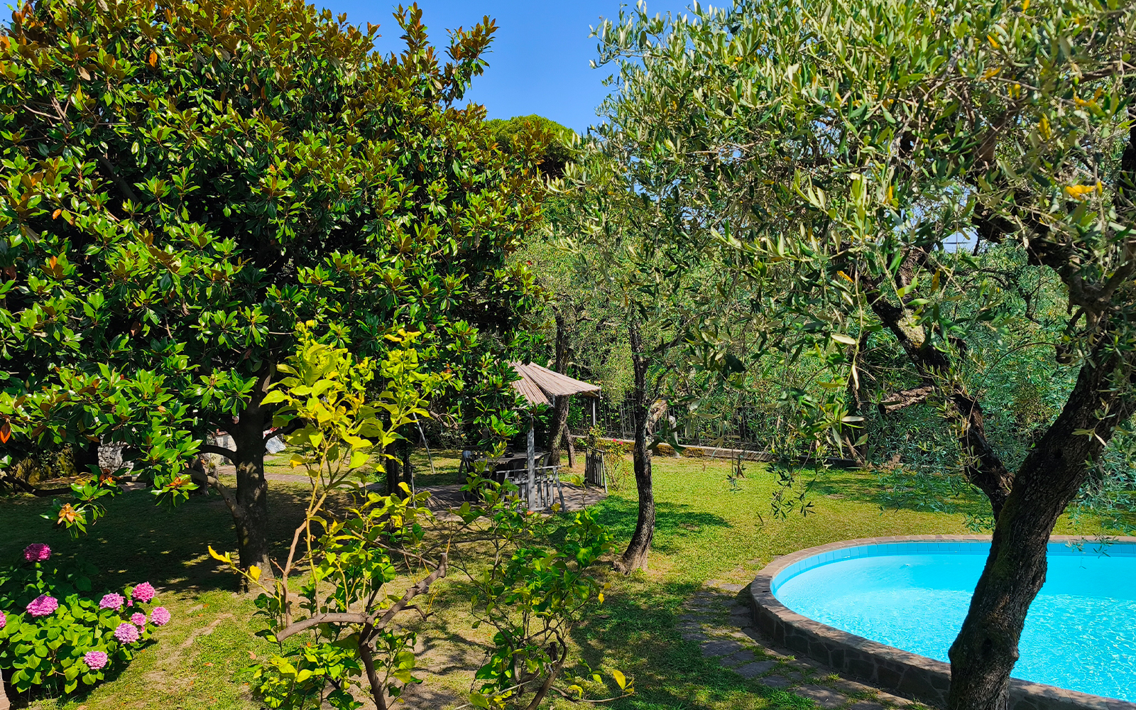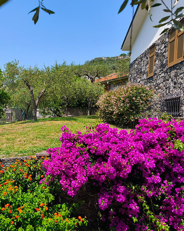 Il giardino di 1.500 mq di Villa Angelica è un vero paradiso, con piante, fiori, un gazebo per rilassarsi, , per i più sportivi, un tavolo da ping-pong e un canestro.