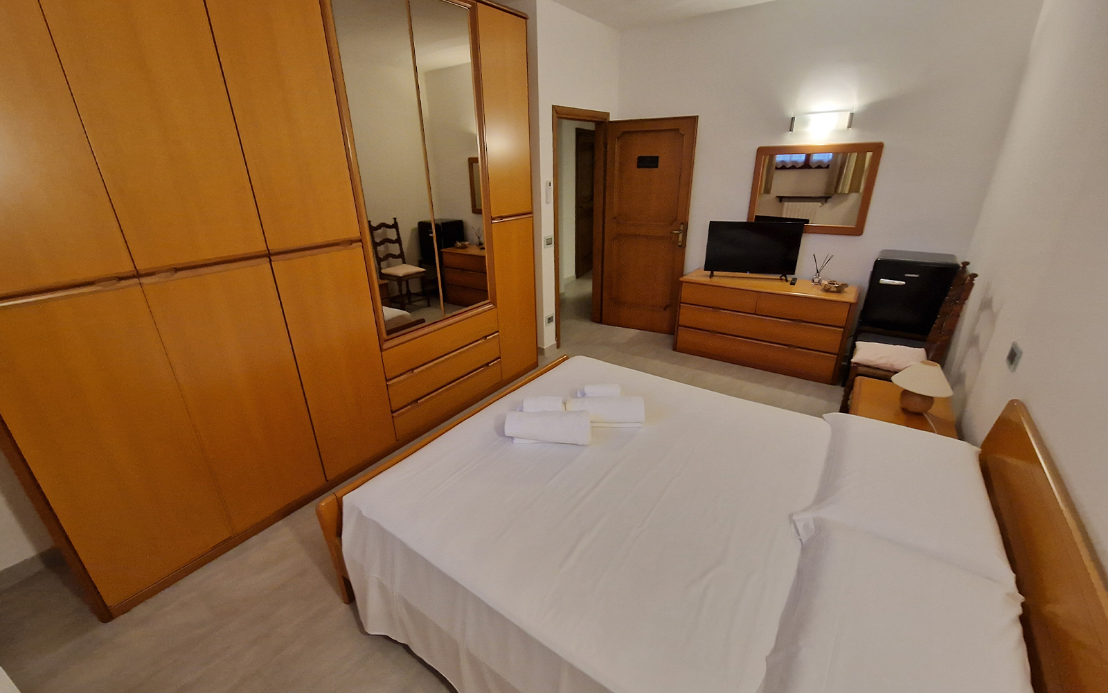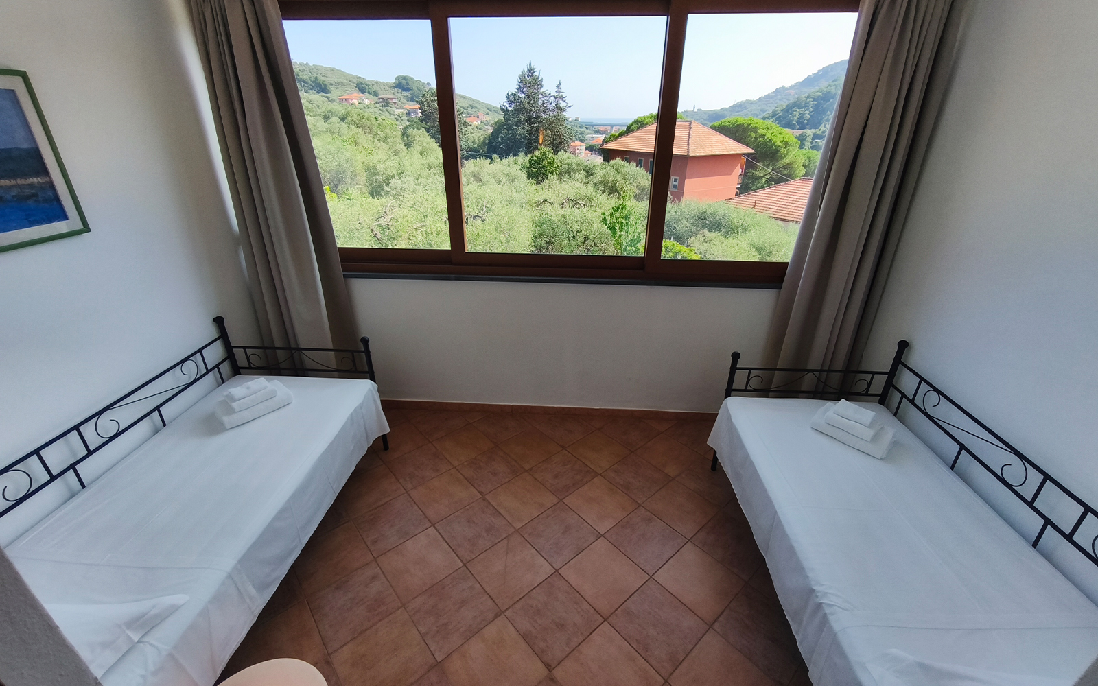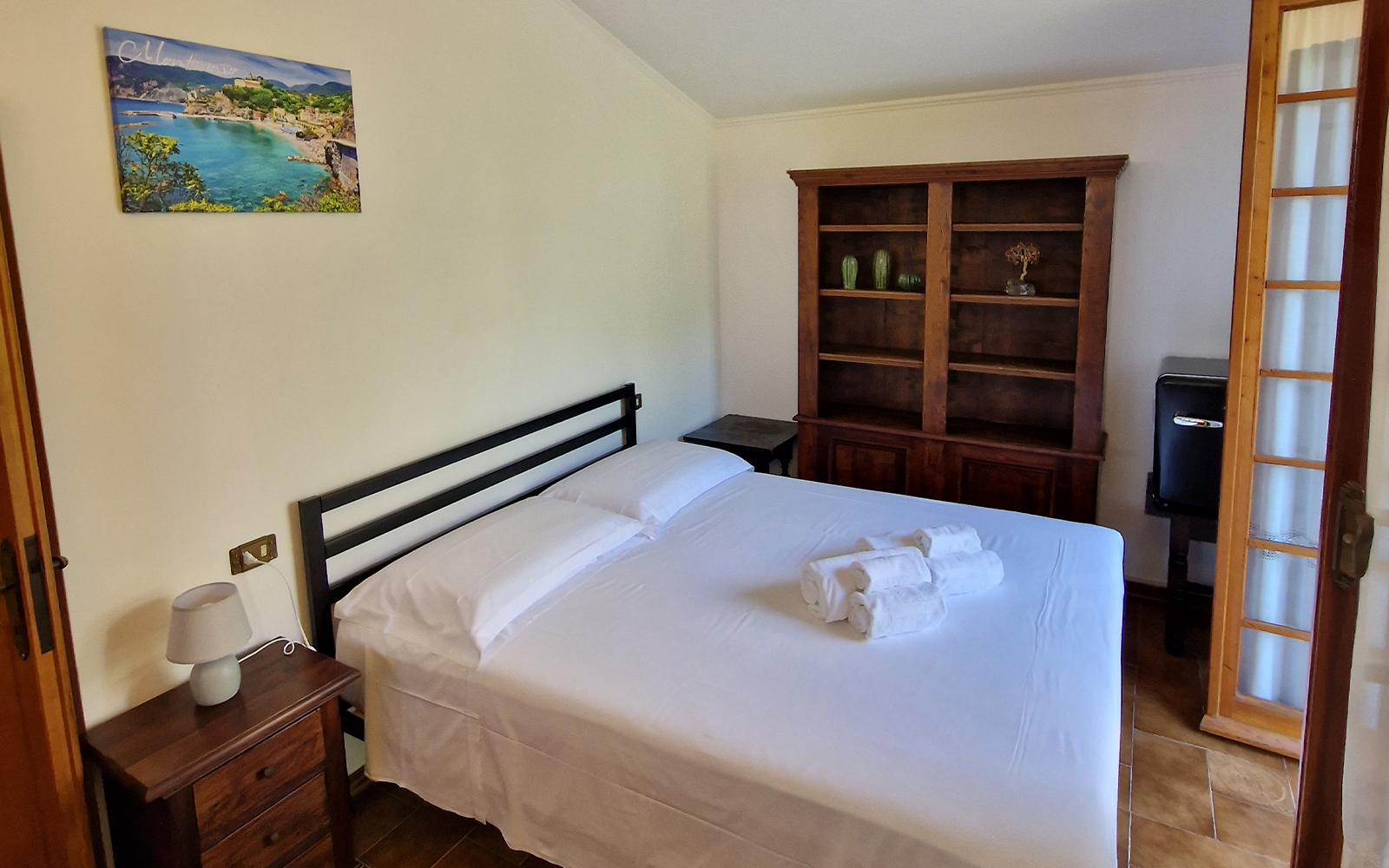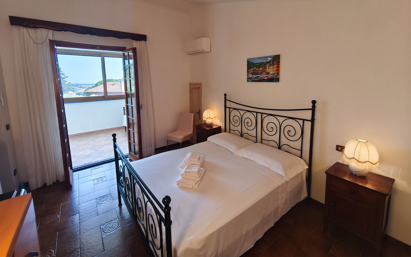 Camera matrimoniale con veranda privata dotata di due letti singoli aggiuntivi, che la trasformano in una spaziosa quadrupla.